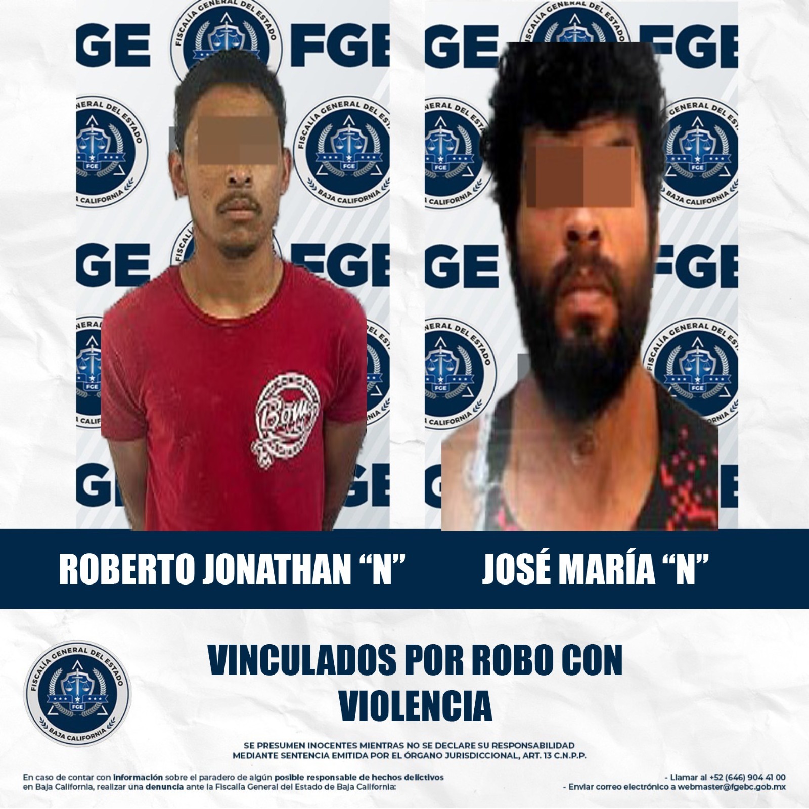 MEXICALI, BAJA CALIFORNIA. - La Fiscalía Regional de Mexicali, a través de la Unidad de Investigación de Delitos Foránea Ciudad Morelos y la Unidad de Investigación de Delitos con Detenidos Poniente, obtuvo la vinculación a proceso de dos hombres por su presunta participación en los delitos de robo con violencia y robo calificado cometido de noche con violencia.
