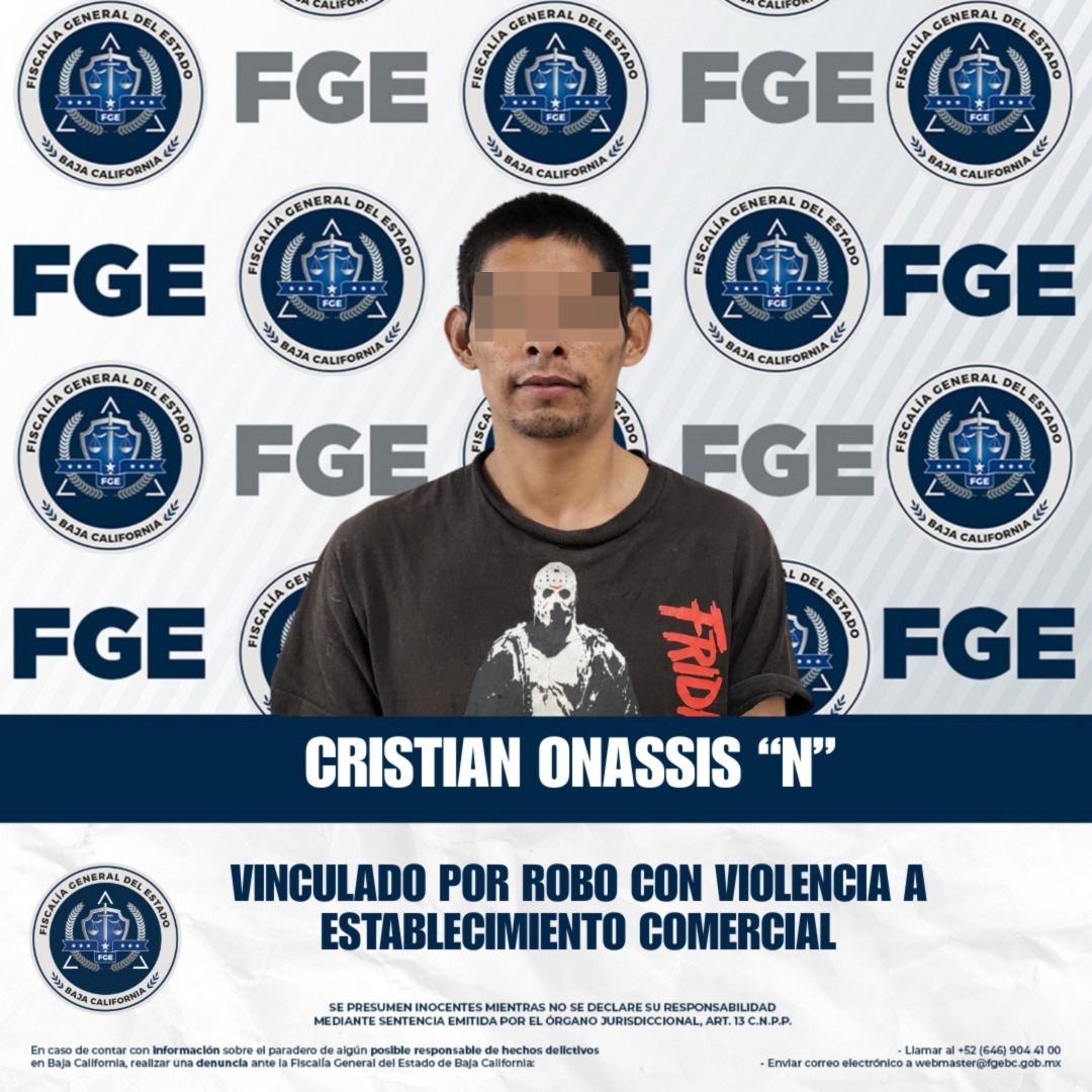 ENSENADA, BAJA CALIFORNIA. - Como resultado de la labor realizada por la Unidad de Investigación de Robos de la Fiscalía Regional de Ensenada, se logró la vinculación a proceso de Cristian Onassis “N”, por su presunta participación en dos hechos distintos relacionados con el delito de robo calificado a establecimiento comercial abierto al público, ejecutado con violencia.