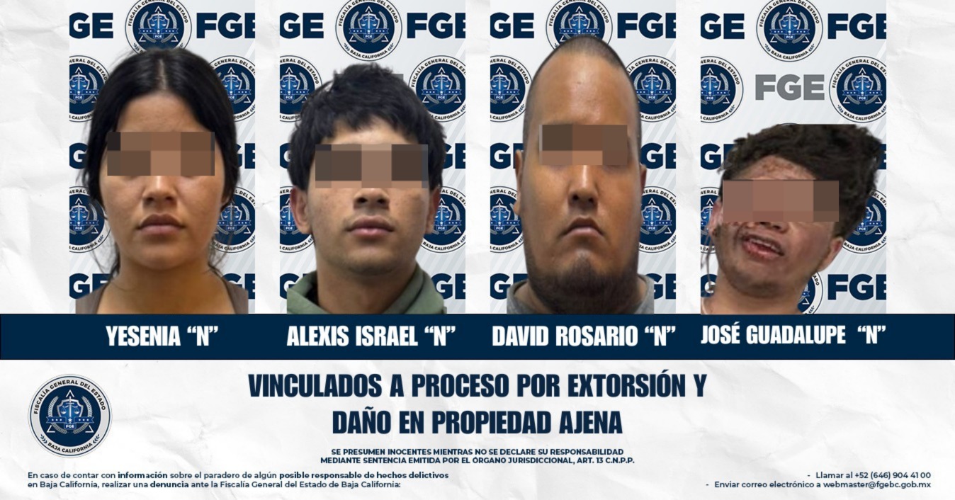 TIJUANA, BAJA CALIFORNIA. - La Fiscalía General del Estado (FGE), a través de la Fiscalía Regional de Tijuana y la Unidad de Investigación con Detenido Zona Tijuana, logró que un juez de control vinculara a proceso a cuatro personas por los delitos de extorsión agravada y daño en propiedad ajena agravado por incendio, imponiéndoles como medida cautelar la prisión preventiva justificada. Asimismo, se fijó un plazo de dos meses para continuar fortaleciendo la carpeta de investigación.