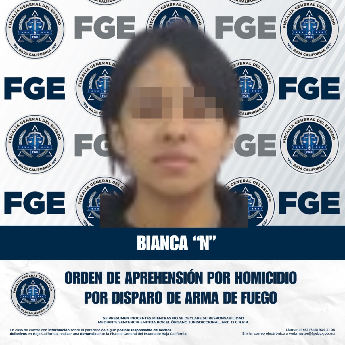TIJUANA, BAJA CALIFORNIA. - La Fiscalía General del Estado de Baja California, bajo las directrices de su titular, la Dra. Ma. Elena Andrade Ramírez, informa que, como resultado de los trabajos de inteligencia y seguimiento a un hecho de alto impacto, la Agencia Estatal de Investigación, adscrita a la Fiscalía Especializada en Delitos Contra la Vida, logró la captura de Bianca “N”, quien contaba con una orden de aprehensión activa por su probable responsabilidad en el delito de homicidio calificado por disparo de arma de fuego.