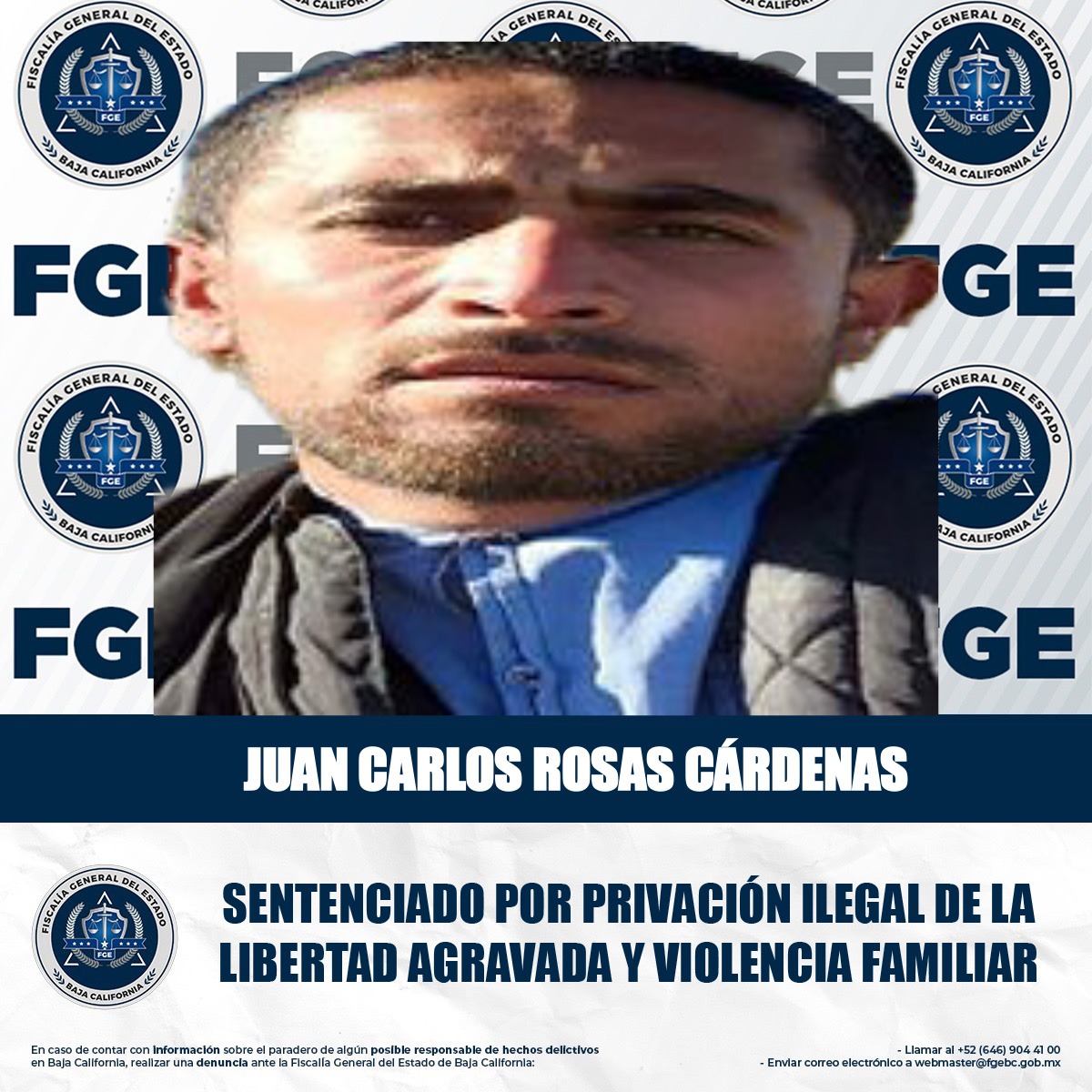 MEXICALI, BAJA CALIFORNIA. - La Fiscalía Regional de Mexicali obtuvo una sentencia condenatoria acumulada de 5 años de prisión en contra de Juan Carlos Rosas Cárdenas, por su responsabilidad en los delitos de privación ilegal de la libertad agravada y violencia familiar.
