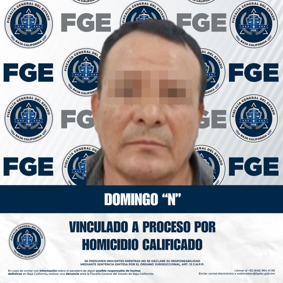 TIJUANA, BAJA CALIFORNIA. - La Fiscalía General del Estado, a través de la Fiscalía Especializada en Delitos Contra la Vida, informa que ha obtenido la vinculación a proceso de Domingo “N” por el delito de homicidio calificado, tras presentar ante el Juez elementos de prueba sólidos que acreditan su probable responsabilidad en la comisión del ilícito.
