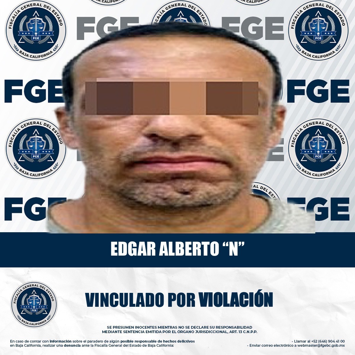 MEXICALI, BAJA CALIFORNIA. - La Fiscalía Regional de Mexicali, a través de la Unidad de Investigación de Delitos con Detenidos Poniente, obtuvo la vinculación a proceso de Edgar Alberto “N”, por su presunta participación en el delito de violación.