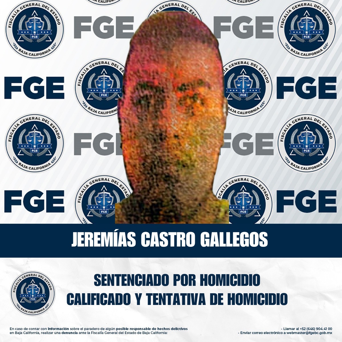 TIJUANA, BAJA CALIFORNIA. - La Fiscalía Regional de Tijuana, a través de la Coordinación de Averiguaciones Previas y Control de Proceso, informa que obtuvo sentencia condenatoria contra Jeremías Castro Gallegos por el delito de homicidio calificado y tentativa de homicidio en contra de dos personas, en hechos registrados hace más de dos décadas.
