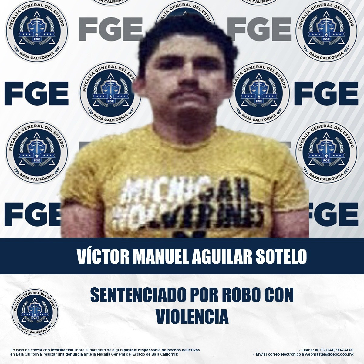 MEXICALI, BAJA CALIFORNIA. - En el marco de su compromiso con la procuración de justicia y el combate a la impunidad, la Fiscalía General del Estado (FGE) logró una sentencia condenatoria de 6 años de prisión contra Víctor Manuel Aguilar Sotelo, por su participación en el delito de robo calificado con violencia cometido por dos o más personas.