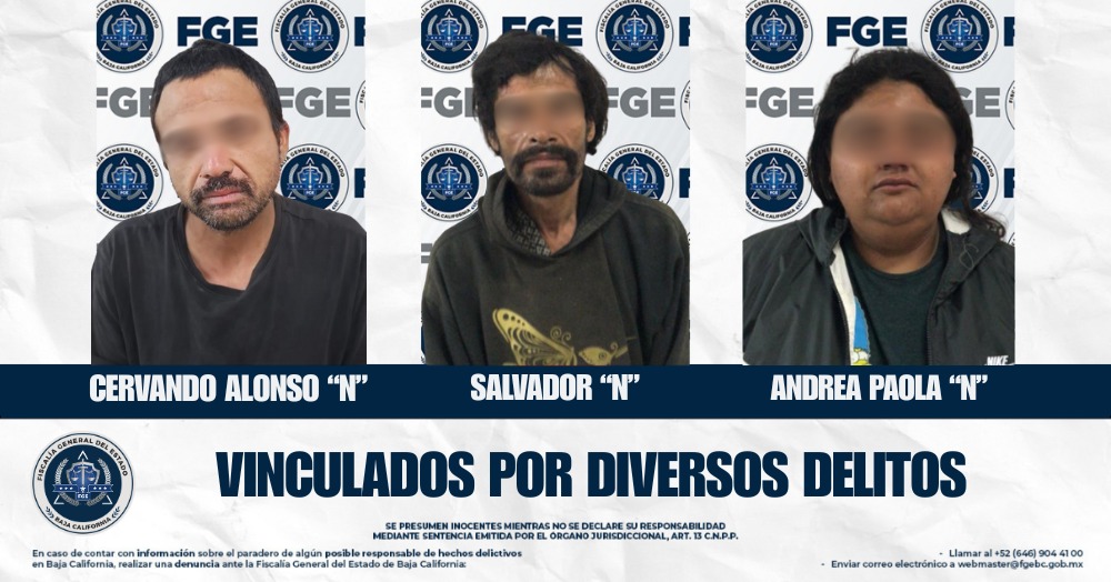 ENSENADA, BAJA CALIFORNIA. - La Fiscalía Regional de Ensenada, a través de la Unidad de Investigación con Detenido, informó que logró la vinculación a proceso de tres personas detenidas en diferentes puntos de la ciudad por su presunta participación en los delitos de robo con violencia en grado de tentativa, violencia familiar y allanamiento de morada.