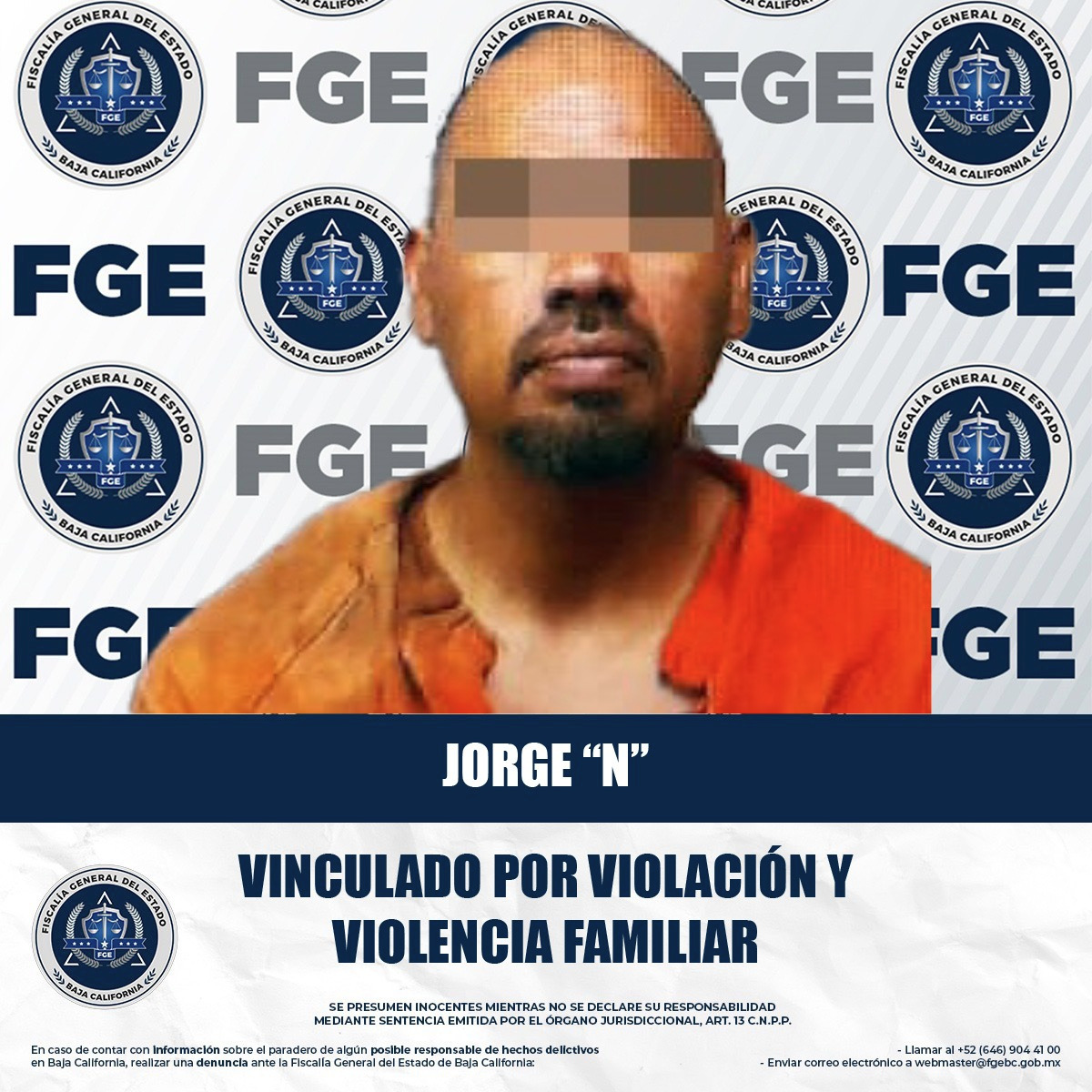 MEXICALI, BAJA CALIFORNIA. - La Fiscalía General del Estado logró la vinculación a proceso de un individuo identificado como Jorge “N”, por su presunta responsabilidad en los delitos de violación y violencia familiar.
