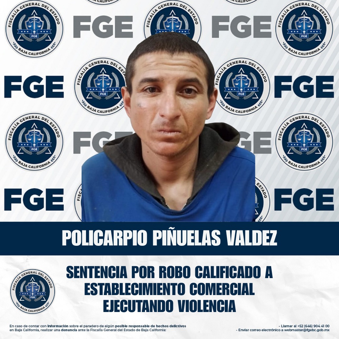 ENSENADA, BAJA CALIFORNIA. - Gracias a la labor realizada por la Unidad de Investigación de Robos de la Fiscalía Regional de Ensenada, se logró obtener una sentencia condenatoria contra Policarpio Piñuelas Valdez, por su responsabilidad en el delito de robo calificado cometido en establecimiento comercial abierto al público, ejecutado con violencia.
