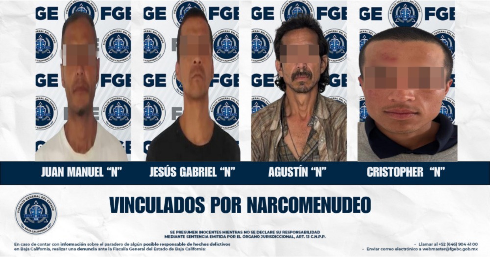 ENSENADA, BAJA CALIFORNIA. - La Fiscalía General del Estado de Baja California, a través de la Fiscalía Especializada en Narcomenudeo, obtuvo la vinculación a proceso de cuatro personas detenidas en distintos puntos del municipio de Ensenada, por su presunta responsabilidad en delitos contra la salud.