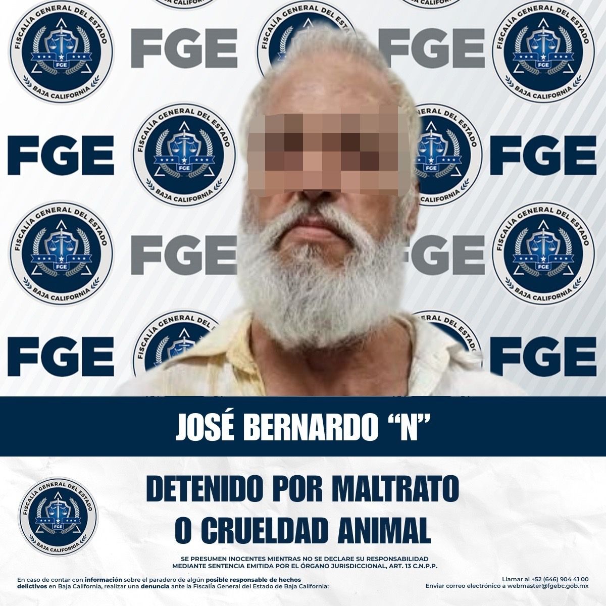 TIJUANA, BAJA CALIFORNIA. - En cumplimiento a la instrucción de la Fiscal General del Estado, Dra. Ma. Elena Andrade Ramírez, de combatir el maltrato animal y llevar ante la justicia a quienes atenten contra la integridad de los seres sintientes, la Fiscalía Especializada en Delitos Ambientales y Contra los Animales logró la detención de José Bernardo “N” por su presunta responsabilidad en el delito de maltrato o crueldad animal.