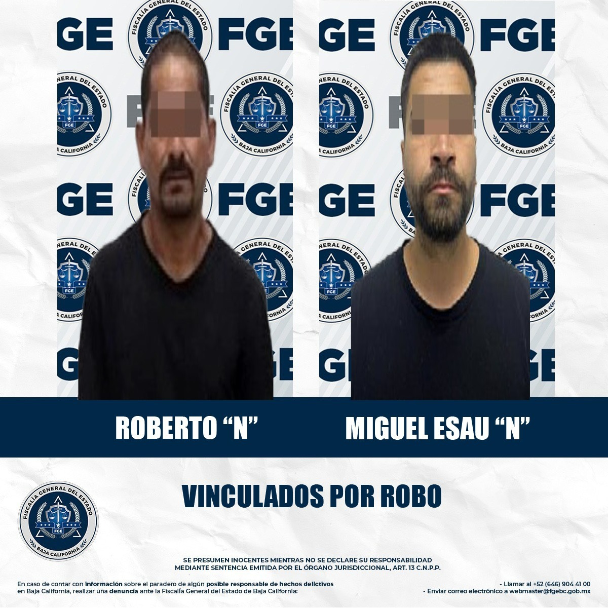 MEXICALI, BAJA CALIFORNIA. - La Fiscalía Regional de Mexicali, a través de las Unidades de Investigación de Delitos de Robo Poniente, obtuvo la vinculación a proceso de dos hombres por su presunta participación en delitos de robo calificado cometidos con violencia y en lugar cerrado.