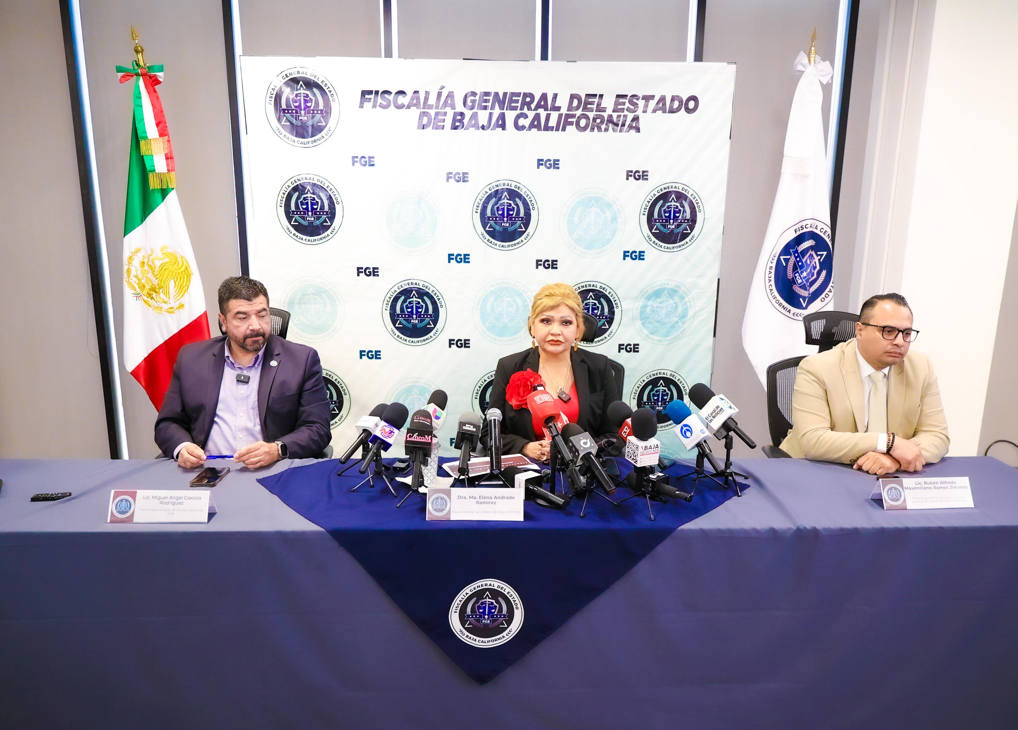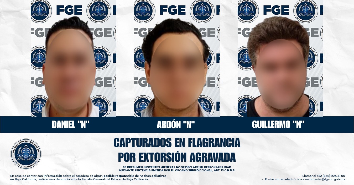 TIJUANA, BAJA CALIFORNIA. - La Fiscal General del Estado, Dra. Ma. Elena Andrade Ramírez, informó sobre la detención en flagrancia de tres individuos identificados como Daniel “N”, Abdón “N” y Guillermo “N”, por su probable responsabilidad en el delito de extorsión agravada, en hechos ocurridos en Mexicali. La intervención fue posible gracias a la llamada de auxilio realizada al 911 por la víctima, un hombre de 60 años, quien aprovechó un descuido de los agresores para alertar a las autoridades desde el baño de un restaurante donde había sido citado.