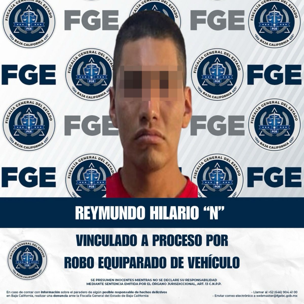 TIJUANA, BAJA CALIFORNIA. - La Fiscalía Regional de Tijuana, a través de la Unidad de Investigación con Detenido, logró obtener la vinculación a proceso de Reymundo Hilario “N”, por el delito de robo equiparado de vehículo de motor, en la modalidad de usar vehículo robado.