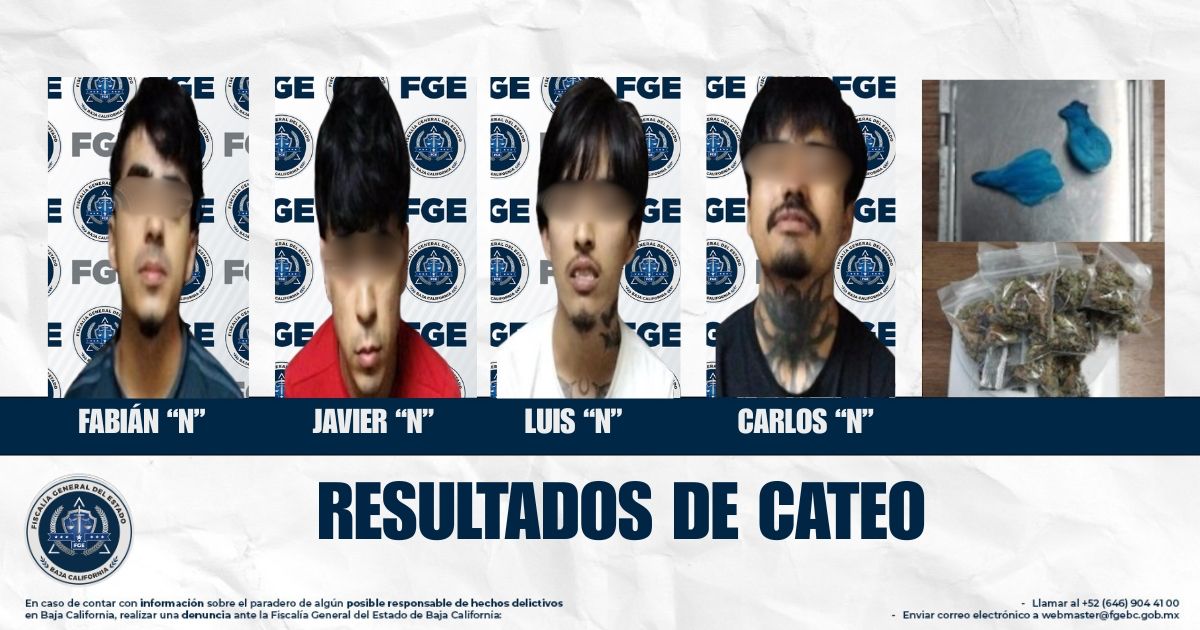 ENSENADA, BAJA CALIFORNIA. - La Fiscalía General del Estado, a través de la Fiscalía Especializada en Narcomenudeo llevó a cabo un cateo en la colonia Las Lomitas, en el municipio de Ensenada, derivado de trabajos de investigación, se logró la detención de cuatro personas y el aseguramiento de sustancias ilícitas.