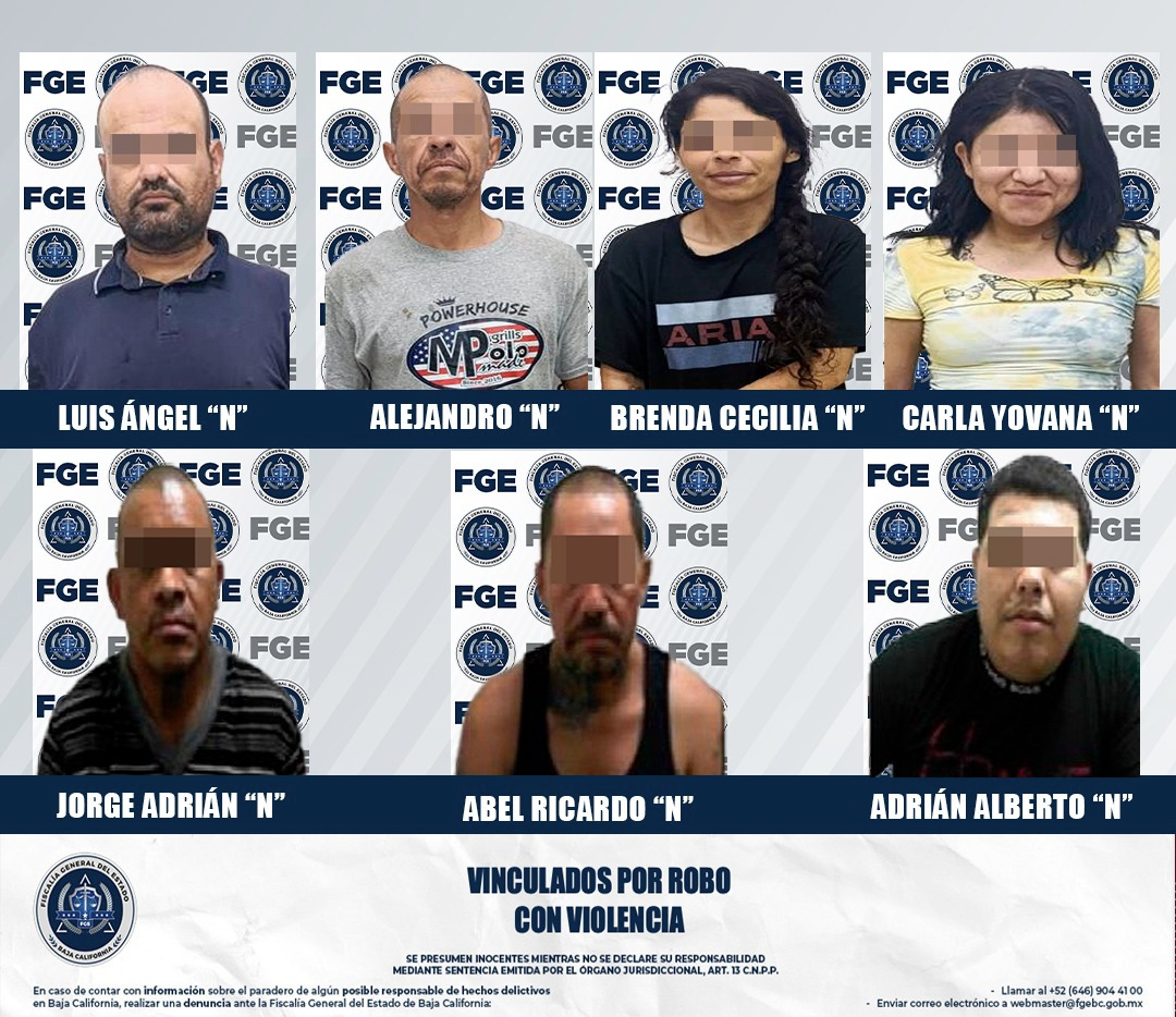 MEXICALI, BAJA CALIFORNIA. - La Fiscalía Regional de Mexicali, a través de las Unidades de Investigación con Detenidos Poniente y Foránea de Guadalupe Victoria, obtuvo la vinculación a proceso de cinco hombres y dos mujeres por su presunta participación en delitos de robo calificado con violencia.