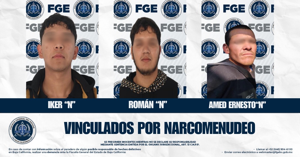 ENSENADA, BAJA CALIFORNIA. - La Fiscalía Especializada en Narcomenudeo de la Fiscalía General del Estado logró que tres hombres fueran vinculados a proceso penal, luego de ser detenidos en flagrancia en distintos hechos registrados en la zona centro de Ensenada. En todos los casos, el Juez de Control impuso la medida cautelar de prisión preventiva.