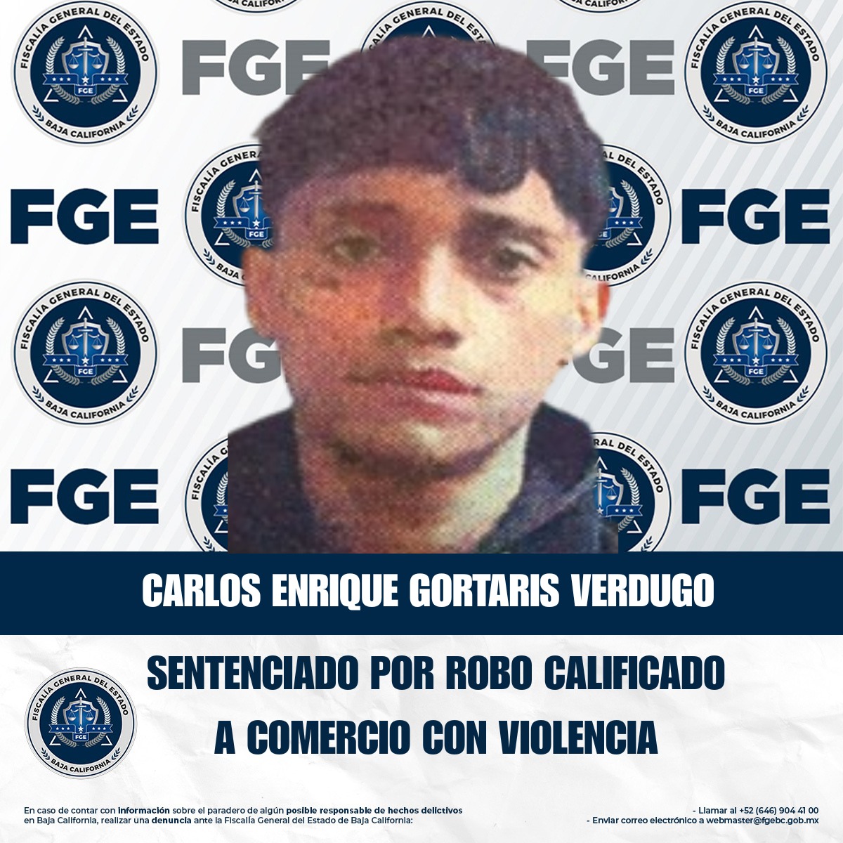 TIJUANA, BAJA CALIFORNIA. - La Fiscalía Regional de Tijuana, a través del trabajo realizado por la Unidad de Investigación de Robos Zona Centro, logró obtener una sentencia condenatoria en contra de Carlos Enrique Gortaris Verdugo, por el delito de robo calificado a establecimiento comercial abierto al público, ejecutado con violencia.