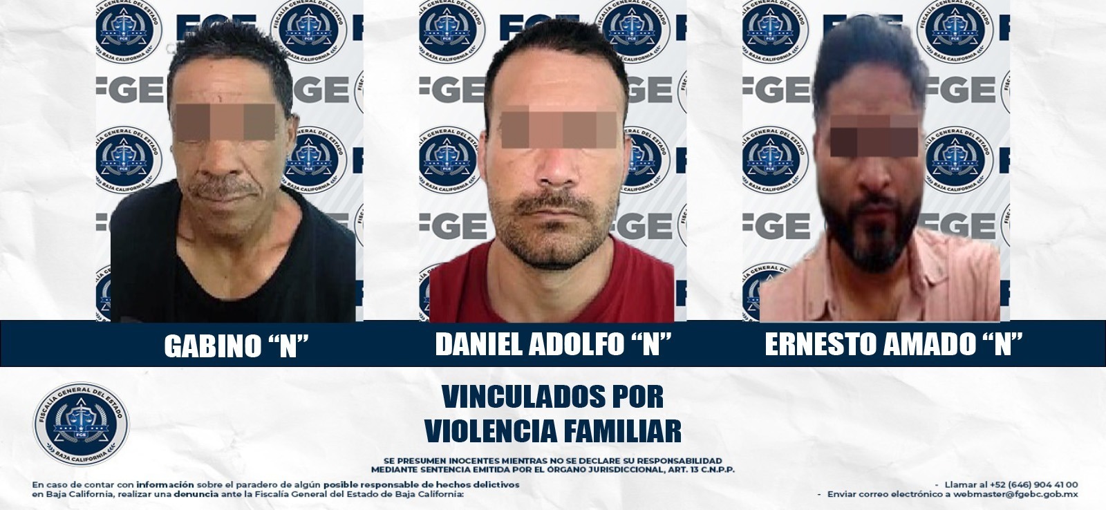 MEXICALI, BAJA CALIFORNIA. - La Fiscalía Regional de Mexicali, a través de las Unidades de Investigación con Detenido Oriente y Poniente, obtuvo la vinculación a proceso de tres individuos del sexo masculino, esto por su presunta participación en el delito de violencia familiar.