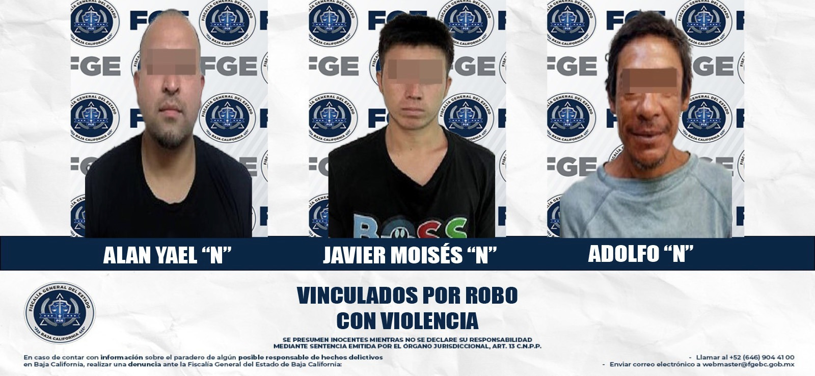 MEXICALI, BAJA CALIFORNIA. - La Fiscalía Regional de Mexicali obtuvo la vinculación a proceso de tres individuos, en audiencias celebradas por separado, por su presunta participación en delitos de robo calificado a establecimiento comercial abierto al público con violencia y robo con violencia.