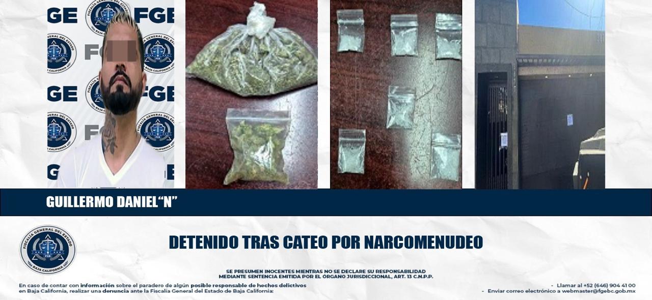 MEXICALI, BAJA CALIFORNIA. - La Fiscalía General del Estado, a través de la Fiscalía Especializada en Narcomenudeo, logró con éxito la realización de un cateo especializado en un inmueble ubicado en el fraccionamiento Villa Florida, consiguiendo de esta forma el aseguramiento de un individuo del sexo masculino, droga, y el recinto anteriormente mencionado.