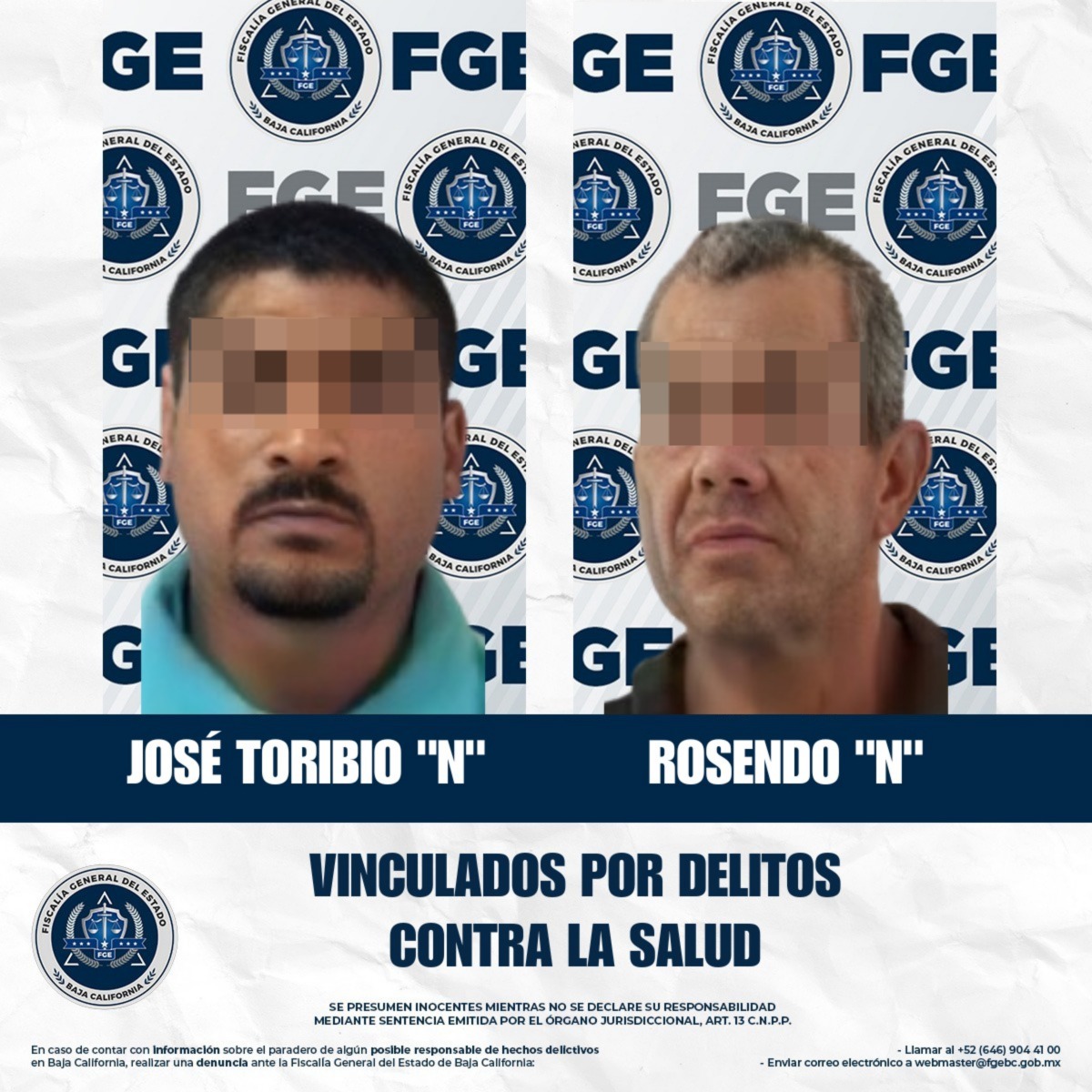 TIJUANA, BAJA CALIFORNIA. - La Fiscalía General del Estado (FGE), bajo la dirección de la Dra. Ma. Elena Andrade Ramírez, continúa reforzando las acciones para el combate de los delitos que atentan contra la paz y la salud de los bajacalifornianos. En esta ocasión, la Fiscalía Regional de Tecate, a través de la Unidad de Investigación con Detenido, informa que ha logrado obtener la vinculación a proceso de dos masculinos, José Toribio “N” y Rosendo “N”, por los delitos de narcomenudeo en su modalidad de posesión simple de la psicotrópica metanfetamina.