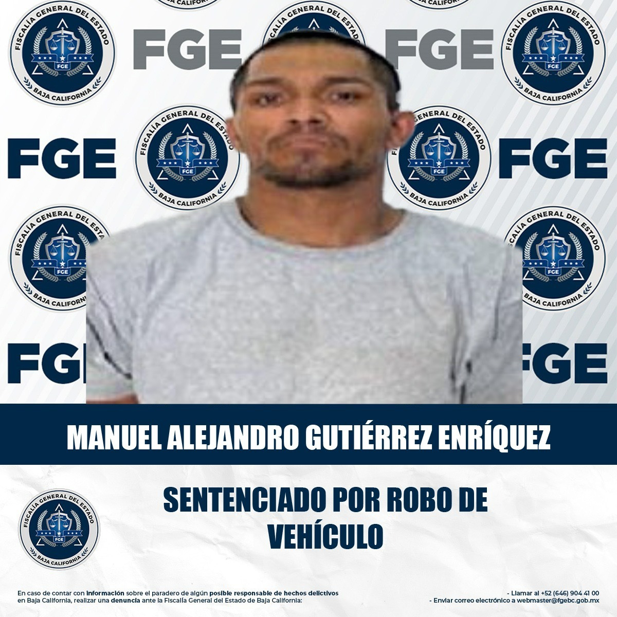MEXICALI, BAJA CALIFORNIA. - La Fiscalía Regional de Mexicali, a través de un procedimiento abreviado, obtuvo sentencia condenatoria de cinco años de prisión contra Manuel Alejandro Gutiérrez Enríquez, alias “El Cuervo”, por su responsabilidad en el delito de robo de vehículo.