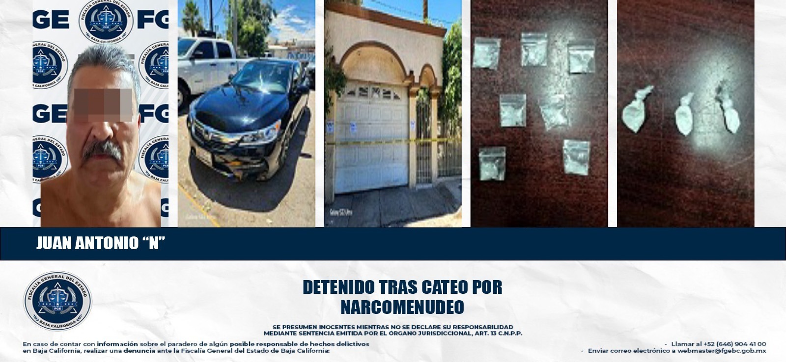 MEXICALI, BAJA CALIFORNIA. - La Fiscalía General del Estado, a través de la Fiscalía Especializada en Narcomenudeo, logró con éxito la implementación de un cateo especializado en un domicilio ubicado en la colonia Baja California.
