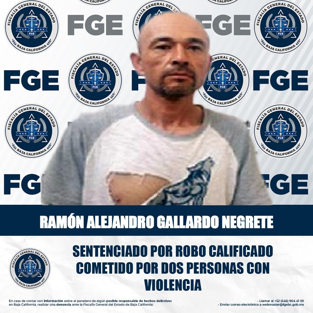 MEXICALI, BAJA CALIFORNIA. - La Fiscalía Regional de Mexicali, a través de la Unidad de Investigación de Delitos con Detenido Poniente, logró obtener una sentencia condenatoria en contra de Ramón Alejandro Gallardo Negrete por el delito de robo calificado cometido por dos personas con violencia.