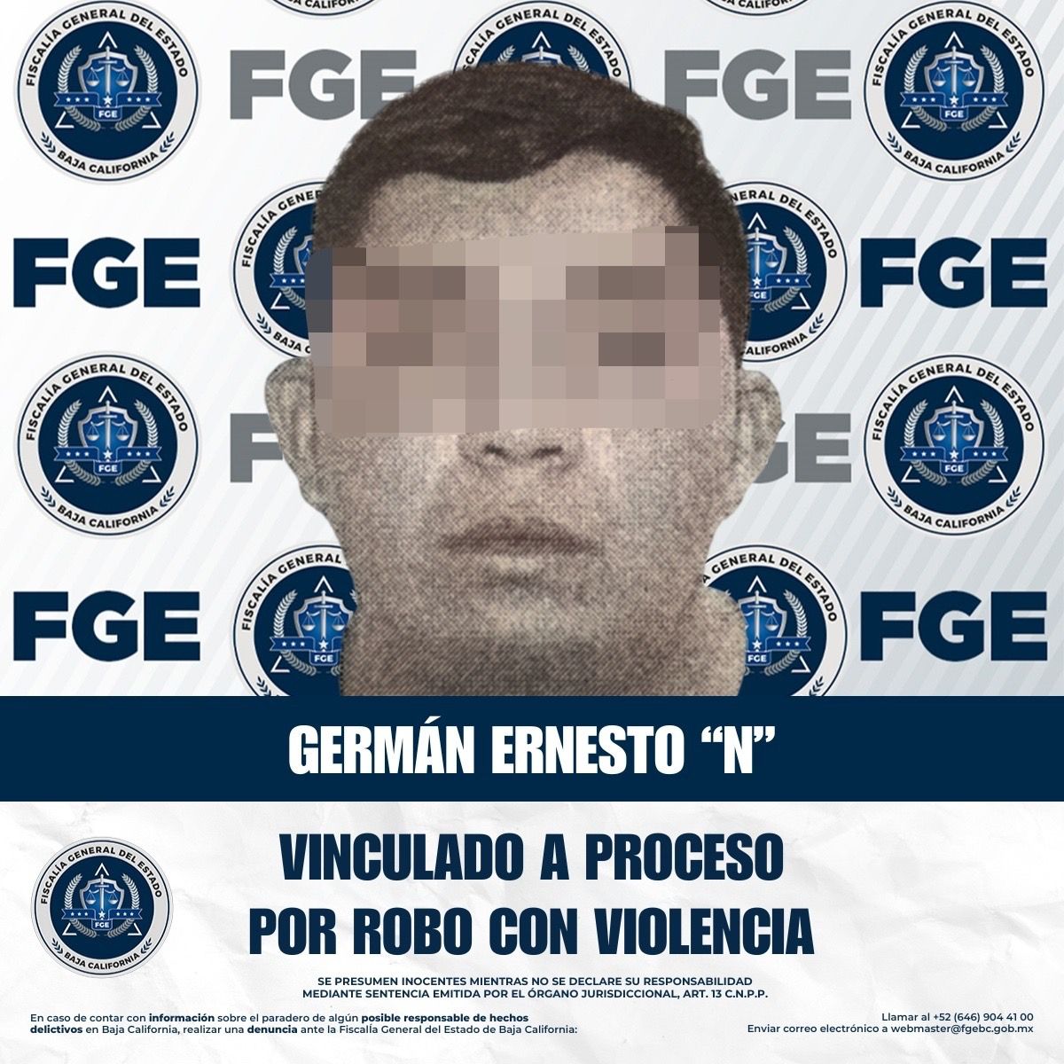 TIJUANA, BAJA CALIFORNIA. - La Fiscalía Regional de Tijuana informa que, como resultado del trabajo coordinado de investigación de gabinete y campo, se obtuvo la vinculación a proceso en contra de Germán Ernesto “N”, por su probable participación en el delito de robo con violencia, cometido en perjuicio de una persona del sexo masculino.