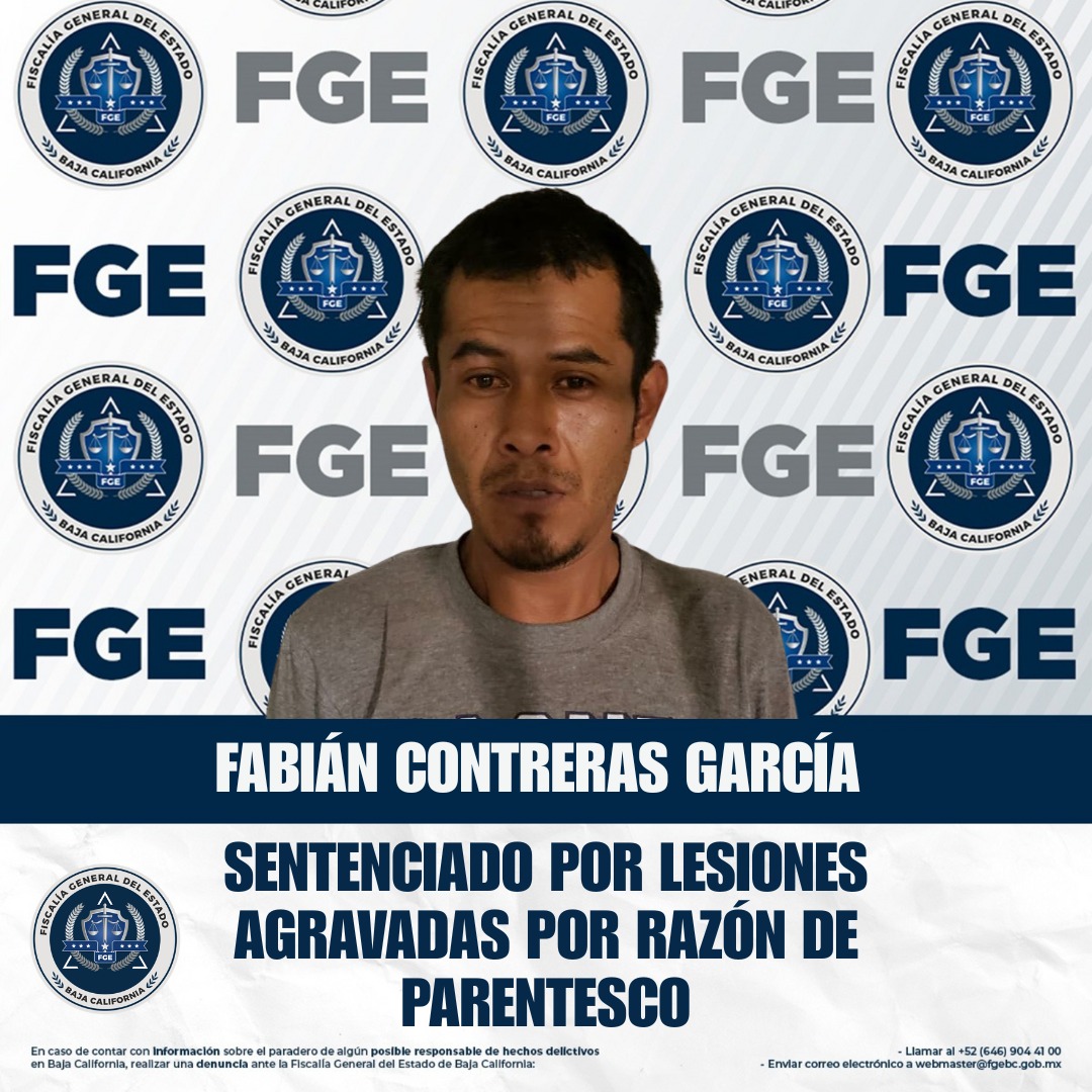 SAN QUINTÍN, BAJA CALIFORNIA. - La Fiscalía Regional de San Quintín obtuvo sentencia condenatoria contra Fabián Contreras García por el delito de lesiones agravadas por razón de parentesco.