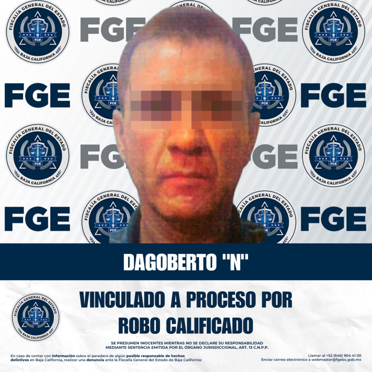 TIJUANA, BAJA CALIFORNIA. - La Fiscalía General del Estado, a través de la Unidad de Investigación de Robos Mariano Matamoros, Zona Tijuana, informa que se obtuvo la vinculación a proceso en contra de Dagoberto “N”, por su presunta responsabilidad en el delito de robo calificado cuando se comete en establecimiento comercial abierto al público.