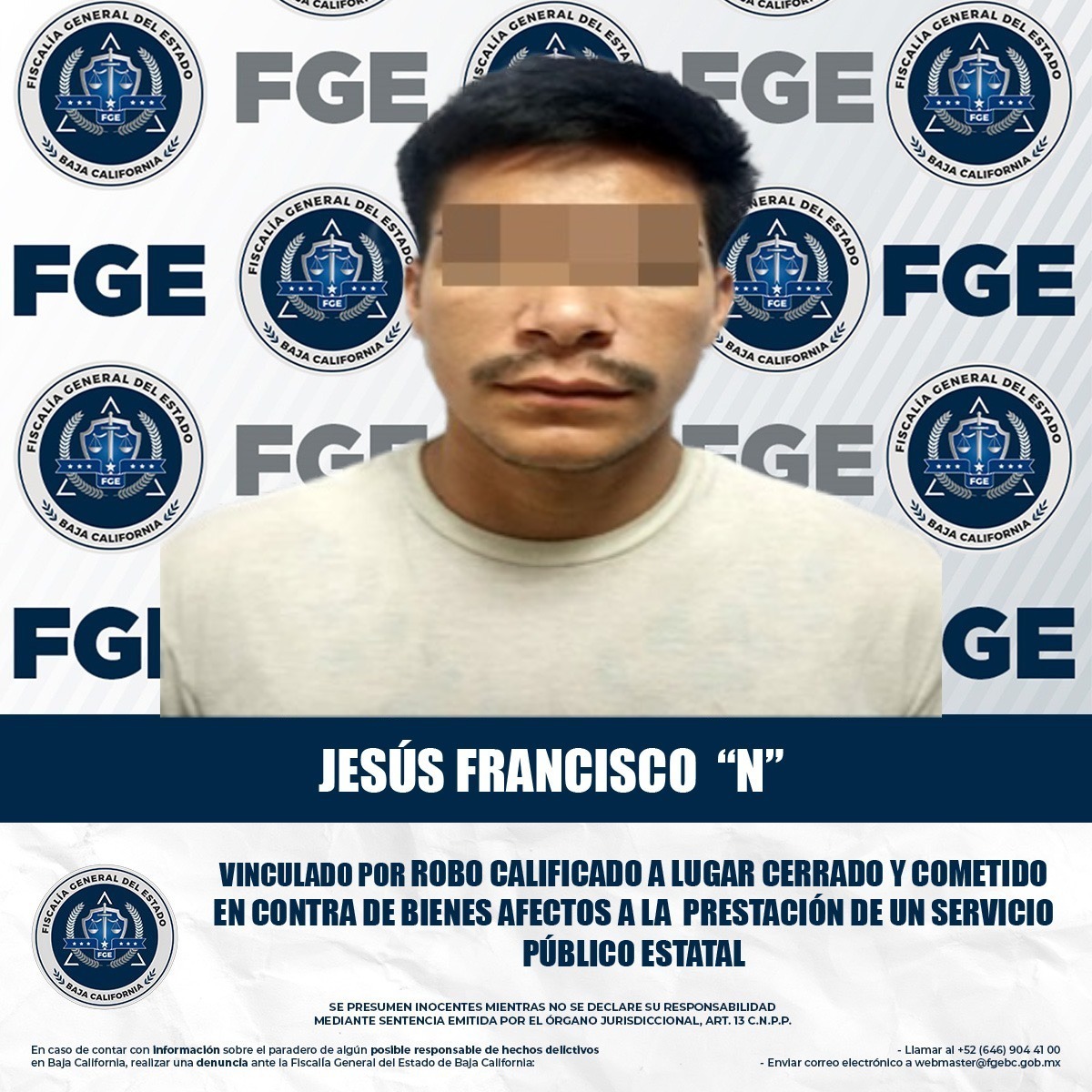 MEXICALI, BAJA CALIFORNIA. - La Fiscalía Regional de Mexicali, a través de la Unidad de Investigación de Delitos de Robo Poniente, obtuvo la vinculación a proceso de un individuo del sexo masculino, esto por su presunta participación en el delito de robo calificado a lugar cerrado y cometido en contra de bienes afectos a la prestación de un servicio público estatal.
