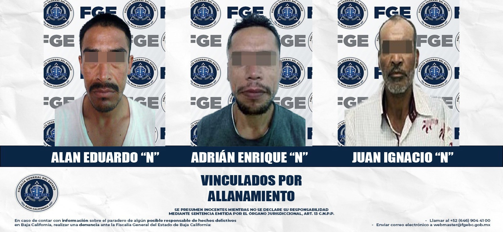 MEXICALI, BAJA CALIFORNIA. - La Fiscalía Regional de Mexicali, a través de las Unidades de Investigación de Detenidos Oriente y Foránea de Guadalupe Victoria, logró la vinculación a proceso de tres hombres por su presunta responsabilidad en el delito de allanamiento de morada, en distintos hechos registrados en la ciudad y el valle de Mexicali.
