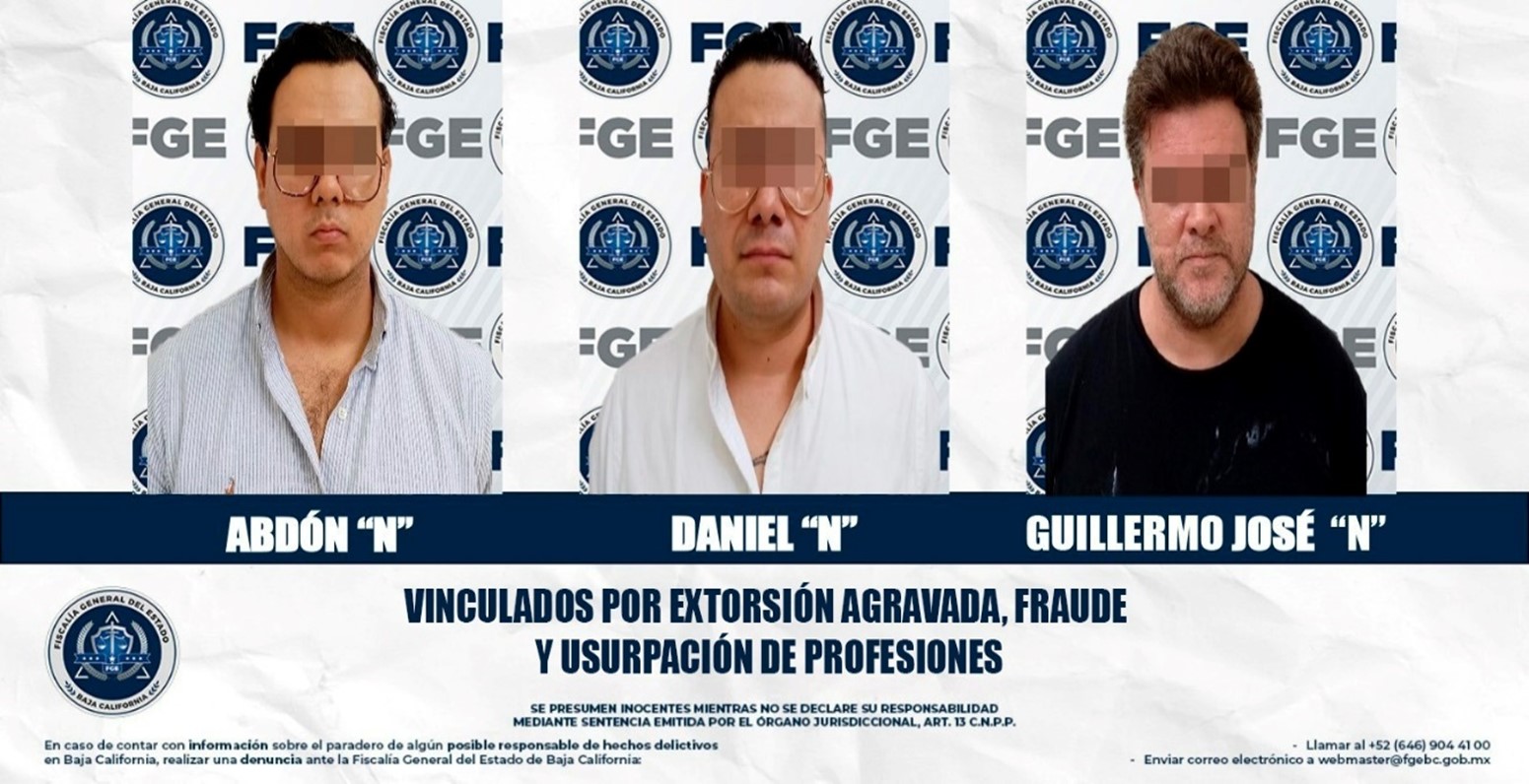 MEXICALI, BAJA CALIFORNIA. - La Fiscalía General del Estado, a través de la Fiscalía Regional de Mexicali, obtuvo una nueva vinculación a proceso contra Daniel “N”, Abdón “N” y Guillermo José “N”, por su presunta participación en los delitos de extorsión agravada, fraude y usurpación de profesiones.