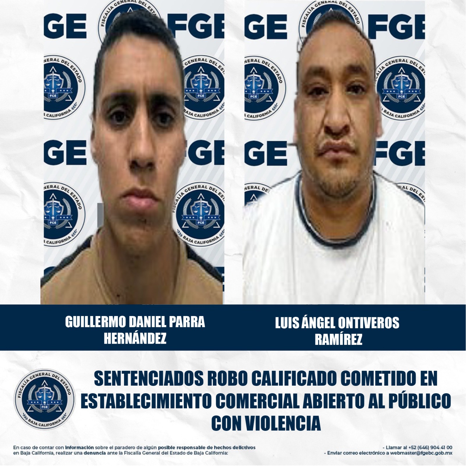 MEXICALI, BAJA CALIFORNIA. - La Fiscalía Regional de Mexicali obtuvo sentencia condenatoria de cuatro años de prisión contra Guillermo Daniel Parra Hernández y Luis Ángel Ontiveros Ramírez, acusados del delito de robo calificado cometido en establecimiento comercial abierto al público con violencia.