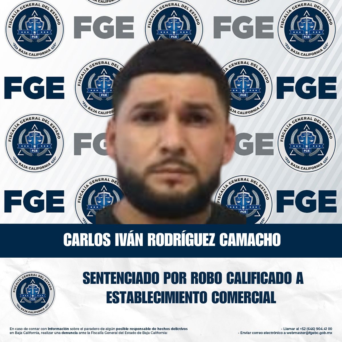 TECATE, BAJA CALIFORNIA. - La Unidad de Investigación Contra Robos, adscrita a la Fiscalía Regional de Tecate, obtuvo sentencia condenatoria en contra de Carlos Iván Rodríguez Camacho, por el delito de robo calificado a establecimiento comercial abierto al público, cometido por dos personas armadas.