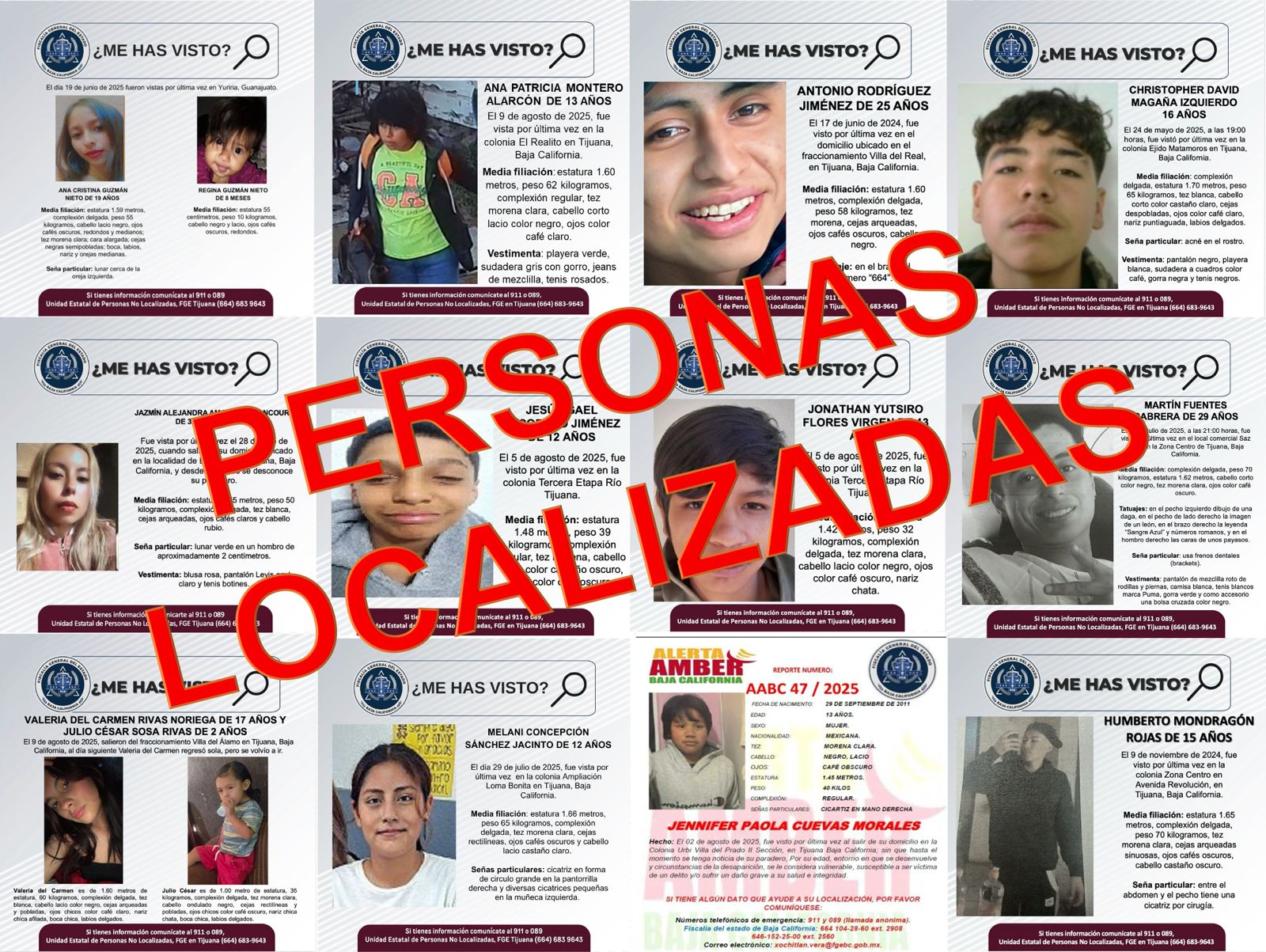 Las personas localizadas son: Ana Cristina Guzmán Nieto, de 19 años; Regina Guzmán Nieto, de 8 meses; Ana Patricia Montero Alarcón, de 13 años; Antonio Rodríguez Jiménez, de 25 años; Christopher David Magaña Izquierdo, de 16 años; Jazmín Alejandra Amador Betancourt, de 32 años; Jesús Gael Escobedo Jiménez, de 12 años; Jonathan Yutsiro Flores Virgen, de 13 años; Martín Fuentes Cabrera, de 29 años; Valeria del Carmen Rivas Noriega, de 17 años; Julio César Sosa Rivas, de 2 años; Melani Concepción Sánchez Jacinto, de 12 años; Jennifer Paola Cuevas Morales, de 13 años; y Humberto Mondragón Rojas, de 15 años. Algunas de estas personas ya han sido reunidas con sus familiares, mientras que otras permanecen bajo resguardo en instituciones gubernamentales para garantizar su seguridad y bienestar.