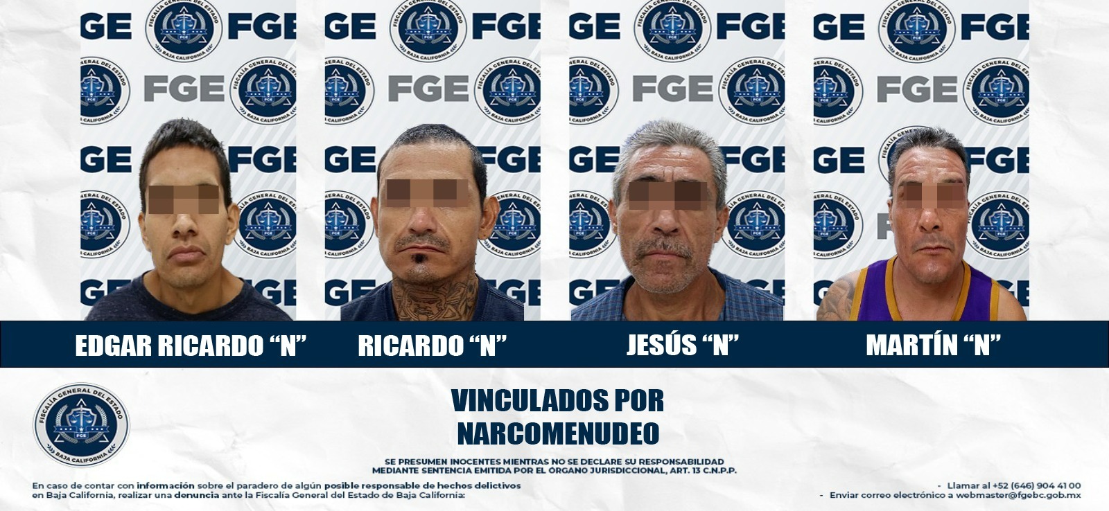 MEXICALI, BAJA CALIFORNIA. - La Fiscalía General del Estado (FGE), a través de la Fiscalía Especializada en Narcomenudeo, logró la vinculación a proceso de cuatro individuos por delitos contra la salud en su modalidad de narcomenudeo, en audiencias celebradas por separado.
