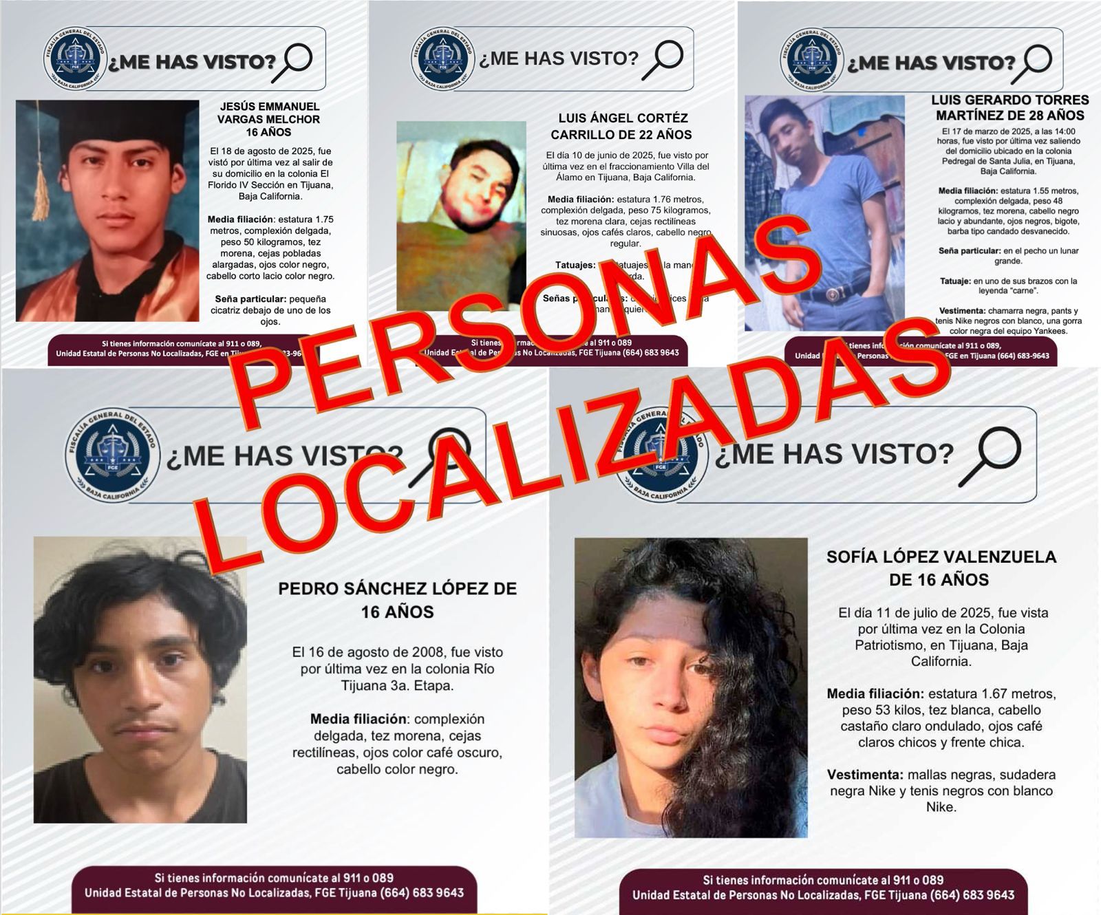 Las personas localizadas son: Jesús Emmanuel Vargas Melchor, de 17 años; Luis Ángel Cortés Carrillo, de 22 años; Luis Gerardo Torres Martínez, de 28 años; Pedro Sánchez López, de 16 años; y Sofía López Valenzuela, de 16 años de edad.