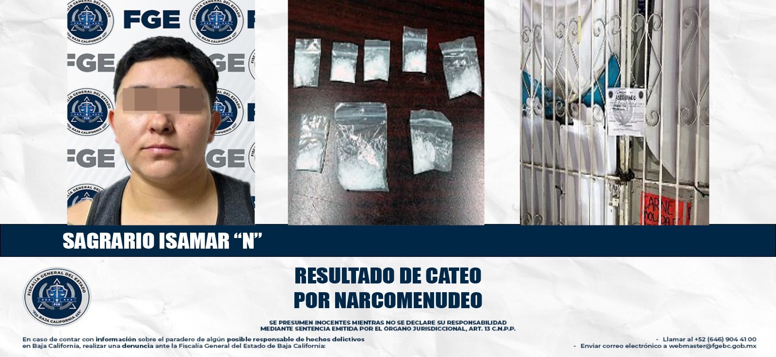 Durante el operativo se logró la detención del individuo identificado como Sagrario Isamar “N”, así como el decomiso de una importante cantidad de narcóticos, entre los que destacan ocho bolsas de plástico transparente que contenían en su interior una sustancia granulada al tacto, con características similares a la droga conocida como metanfetamina. Asimismo, el inmueble quedó asegurado.