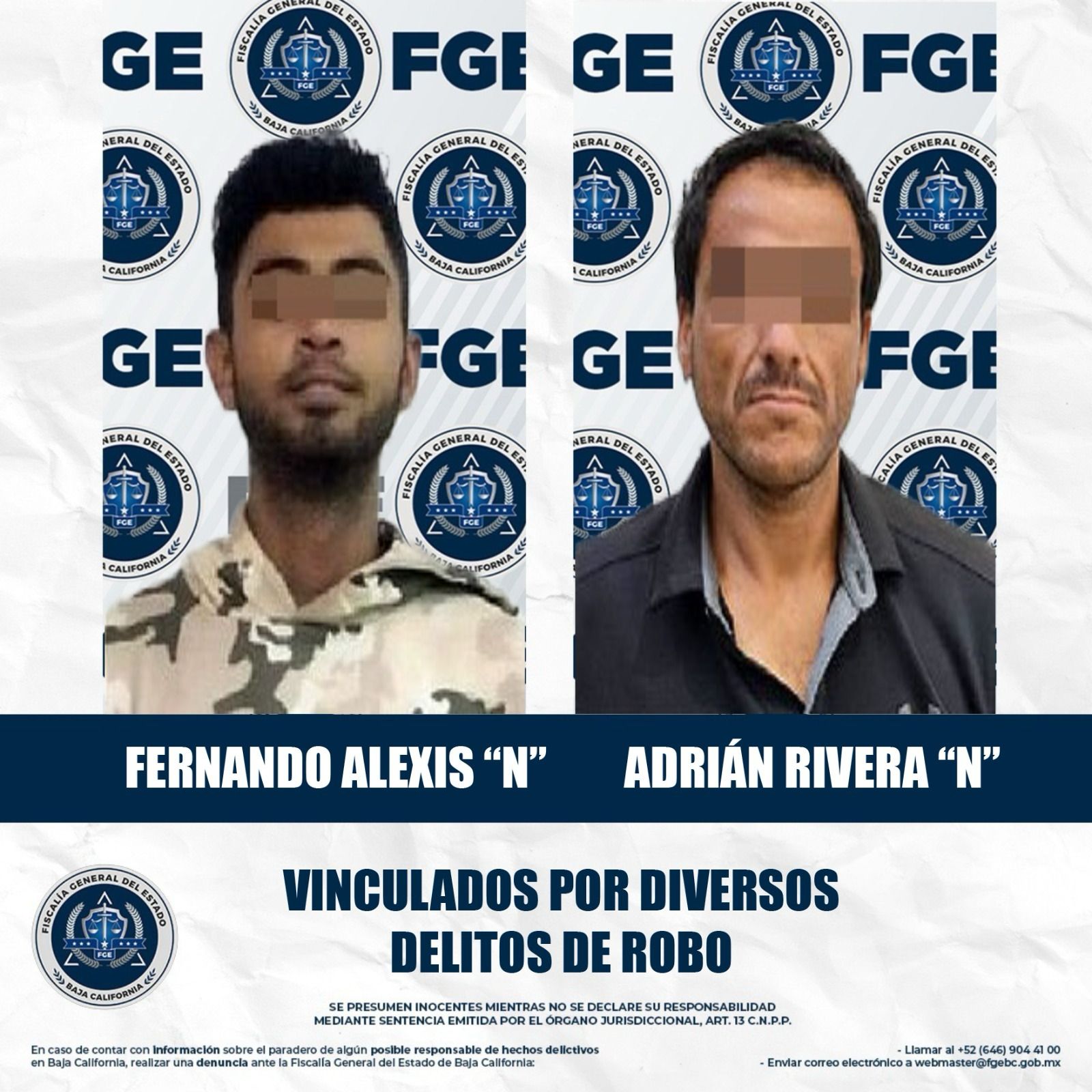 MEXICALI, BAJA CALIFORNIA. - La Fiscalía Regional de Mexicali, a través de la Unidad de Investigación de Delitos con Detenidos Poniente, y de Robos Poniente, obtuvo la vinculación a proceso de dos hombres imputados por el delito de robo calificado cometido a establecimiento comercial abierto al público con violencia, y robo calificado a casa habitación.