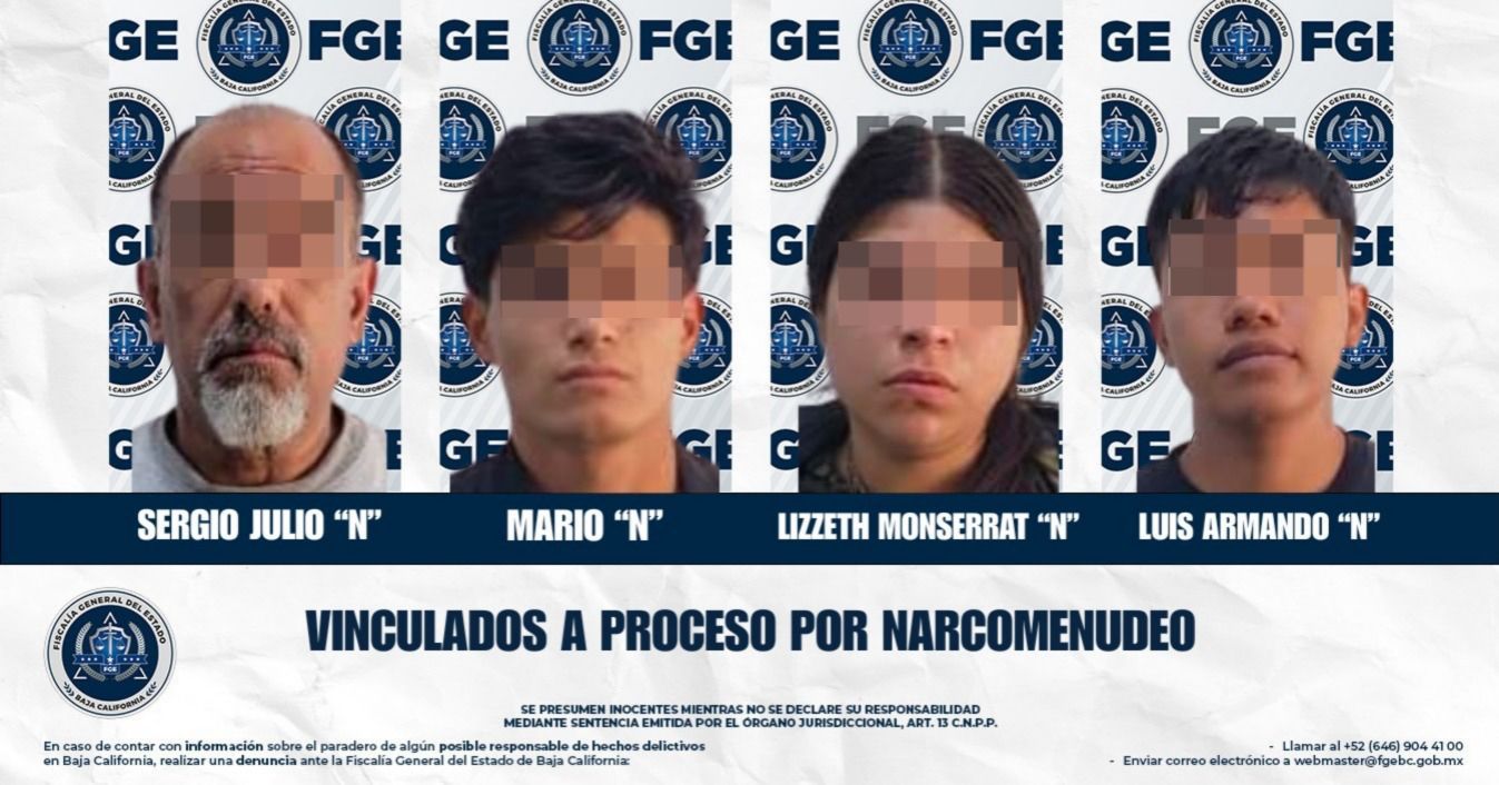 TIJUANA, BAJA CALIFORNIA. - La Fiscalía General del Estado (FGE) informa que cuatro personas imputadas por delitos contra la salud en su modalidad de narcomenudeo fueron vinculadas a proceso penal. Esto, luego de que los elementos de prueba presentados por el Ministerio Público resultaron suficientes para que los jueces de control determinaran dicha resolución.