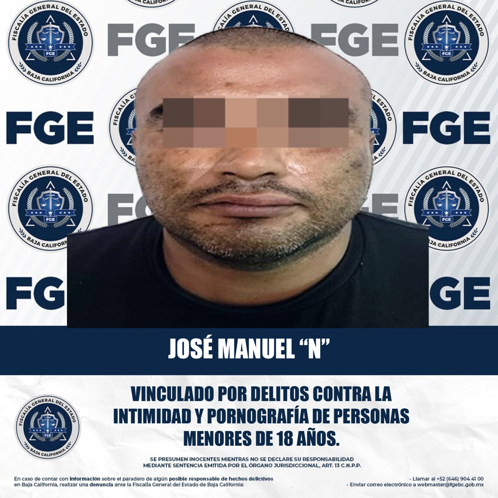 MEXICALI, BAJA CALIFORNIA. - La Fiscalía General del Estado, a través de la Unidad de Investigación con Detenido Oriente, obtuvo el auto de vinculación a proceso en contra de José Manuel “N”, por su probable responsabilidad en el delito contra la intimidad y pornografía de personas menores de 18 años.