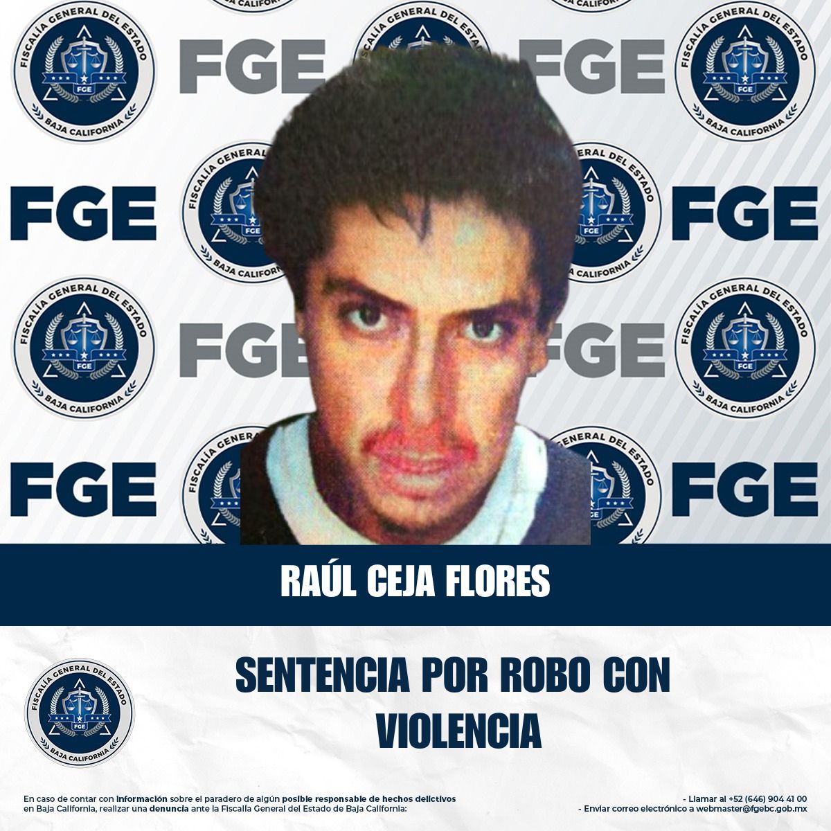 TIJUANA, BAJA CALIFORNIA. - La Unidad de Investigación de Robos Zona La Mesa de la Fiscalía Regional de Tijuana obtuvo sentencia condenatoria en contra de Raúl Ceja Flores, por el delito de robo con violencia.