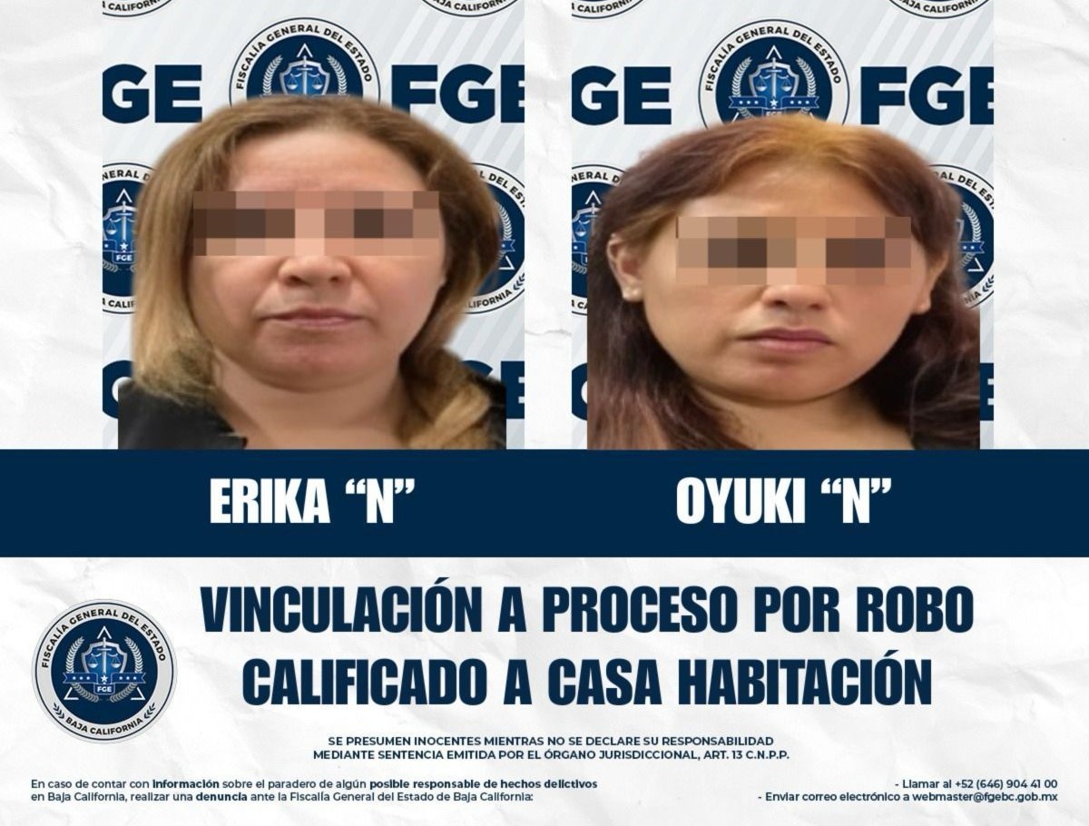 TIJUANA, BAJA CALIFORNIA. - La Fiscalía Regional de Tijuana, a través de la Unidad de Investigación de Robos de la zona Mariano Matamoros, informa que se obtuvo la vinculación a proceso de dos mujeres, identificadas como Erika “N” y Oyuki “N”, por su probable responsabilidad en el delito de robo calificado a casa habitación cometido por dos o más personas.