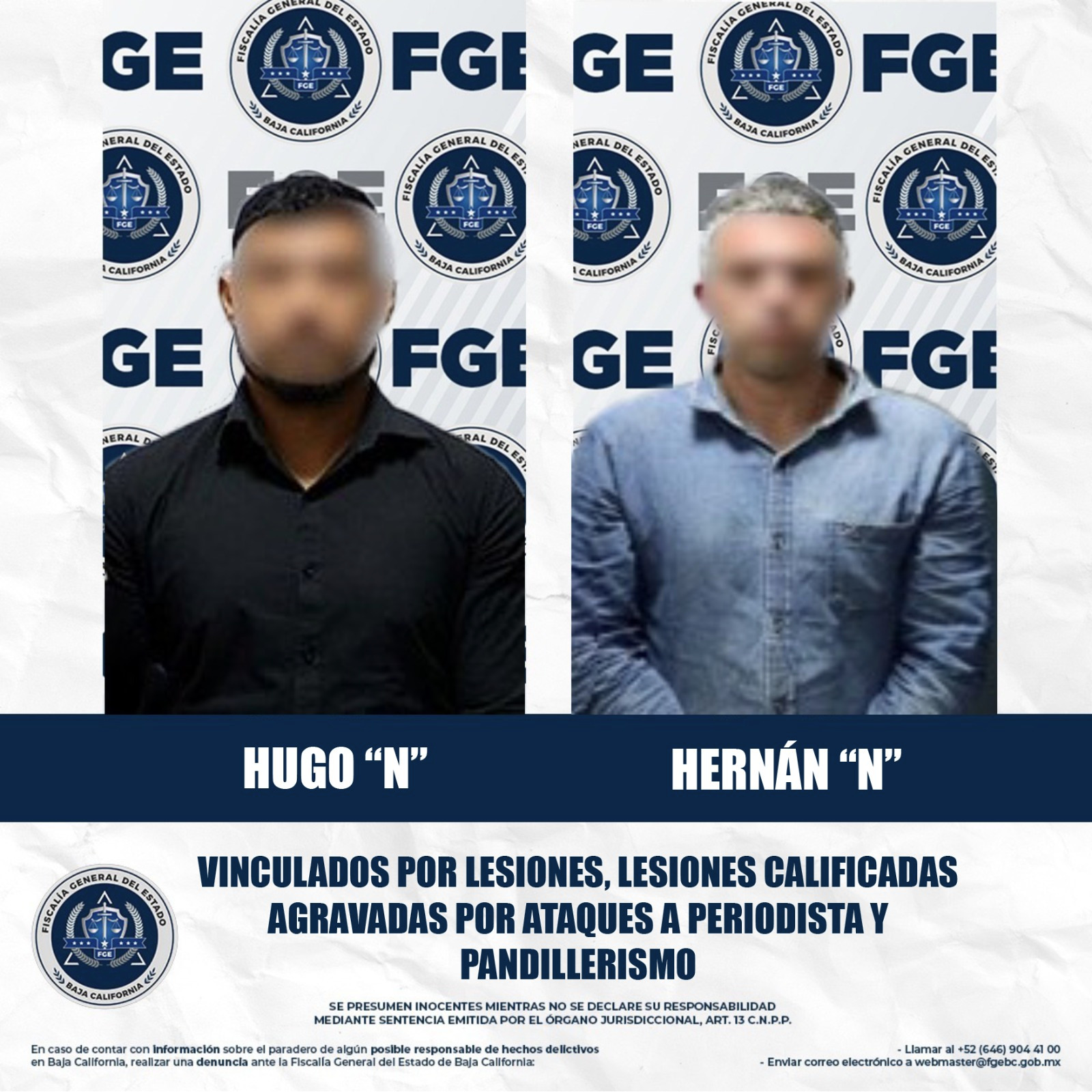 MEXICALI, BAJA CALIFORNIA. - Presuntos agresores del periodista Jorge Heras, registrada la mañana 26 de agosto, en la colonia Cuauhtémoc Sur de esta capital, enfrentaran proceso penal, con base a las pruebas presentadas por la Fiscalía General del Estado (FGE).