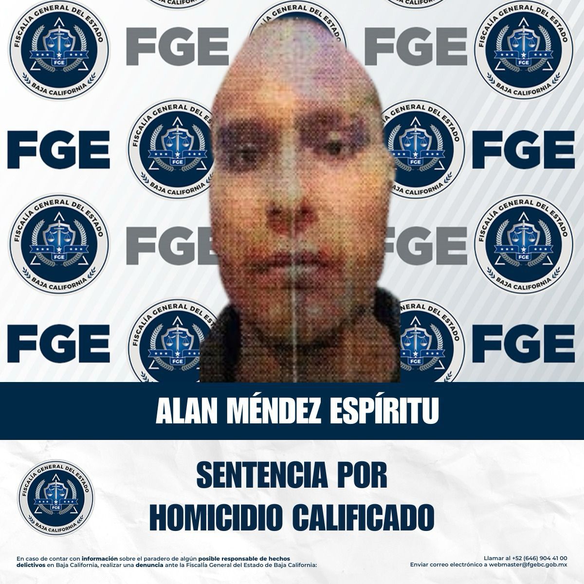 TIJUANA, BAJA CALIFORNIA. - La Fiscalía Regional de Tijuana, a través de la Coordinación de Averiguaciones Previas y Control de Procesos, obtuvo sentencia condenatoria de 23 años de prisión en contra de Alan Méndez Espíritu, alias “El Negro”, por su responsabilidad en el delito de homicidio calificado.