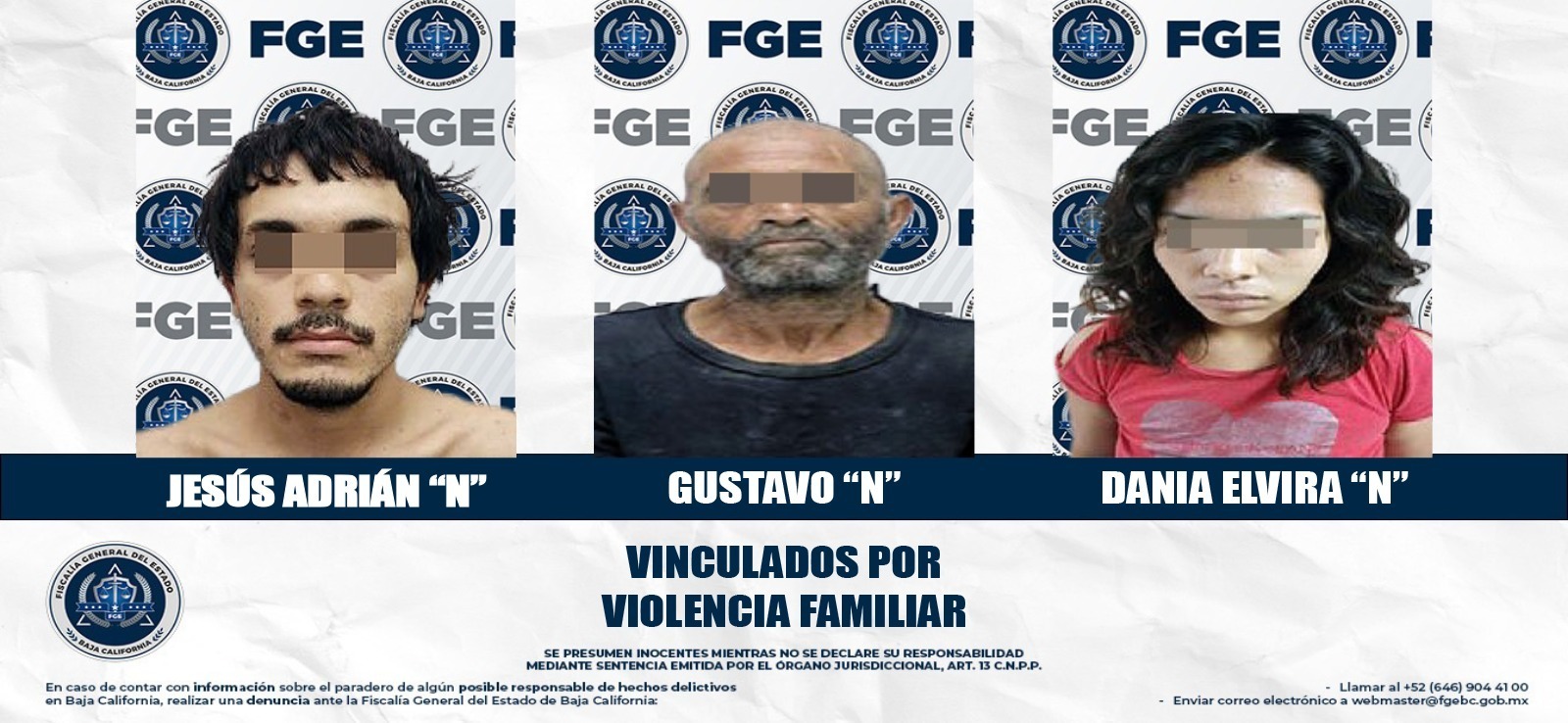 MEXICALI, BAJA CALIFORNIA. - La Fiscalía Regional de Mexicali, a través de las Unidades de Investigación de Delitos Foránea de Guadalupe Victoria y Ciudad Morelos, obtuvo la vinculación a proceso de tres personas imputadas por el delito de violencia familiar.