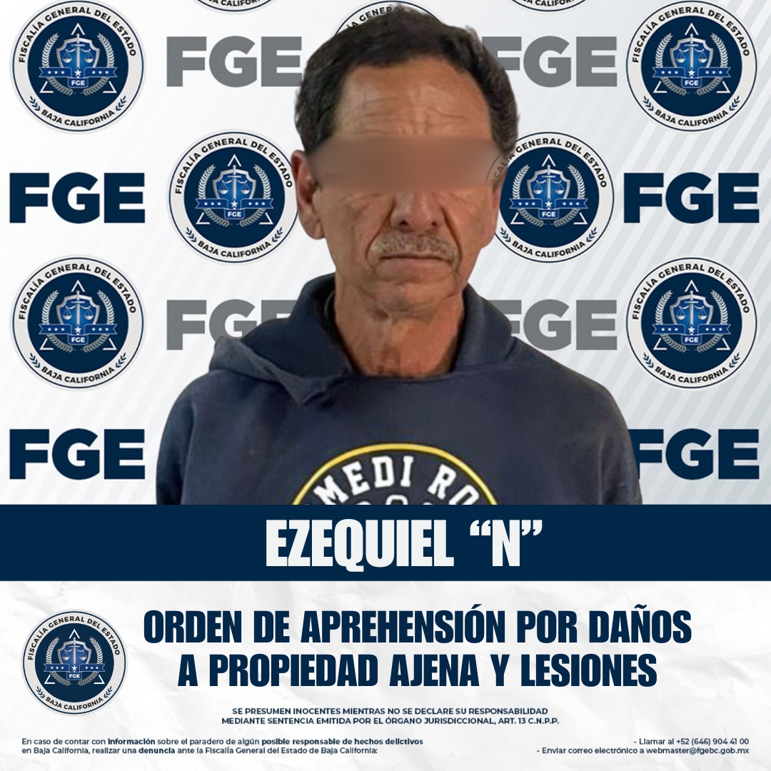 SAN QUINTÍN, BAJA CALIFORNIA. - La Fiscalía Regional de San Quintín, en coordinación con la Agencia Estatal de Investigación, cumplimentó una orden de aprehensión en contra de Ezequiel “N”, por su presunta participación en los delitos de daños a propiedad ajena y lesiones.