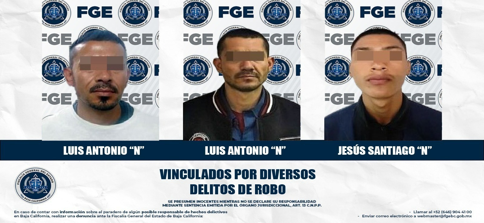 MEXICALI, BAJA CALIFORNIA. - La Fiscalía Regional de Mexicali, a través de la Unidad de Investigación de Delitos de Robo Oriente, obtuvo la vinculación a proceso de tres hombres imputados por diversos delitos de robo.